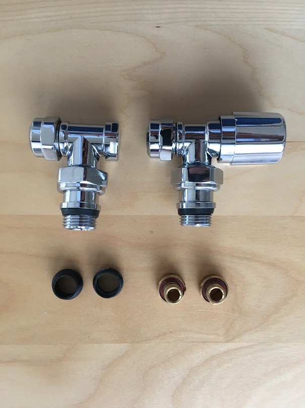 Een fraai afgewerkte aansluitset of radiator kraanset voor een handbediende instelling van een design radiator. De hier getoonde haakse uitvoering, met een kunststof chroom knop, is voordelig in aanschaf. Doordat de aansluitset met een O-ring aansluiting is uitgevoerd is een eenvoudige montage aan de radiator gegarandeerd. De aansluitset wordt standaard geleverd inclusief een koppelset voor 15mm cv-buis alsook alsook voor een 16 x 2mm kunststof leiding.